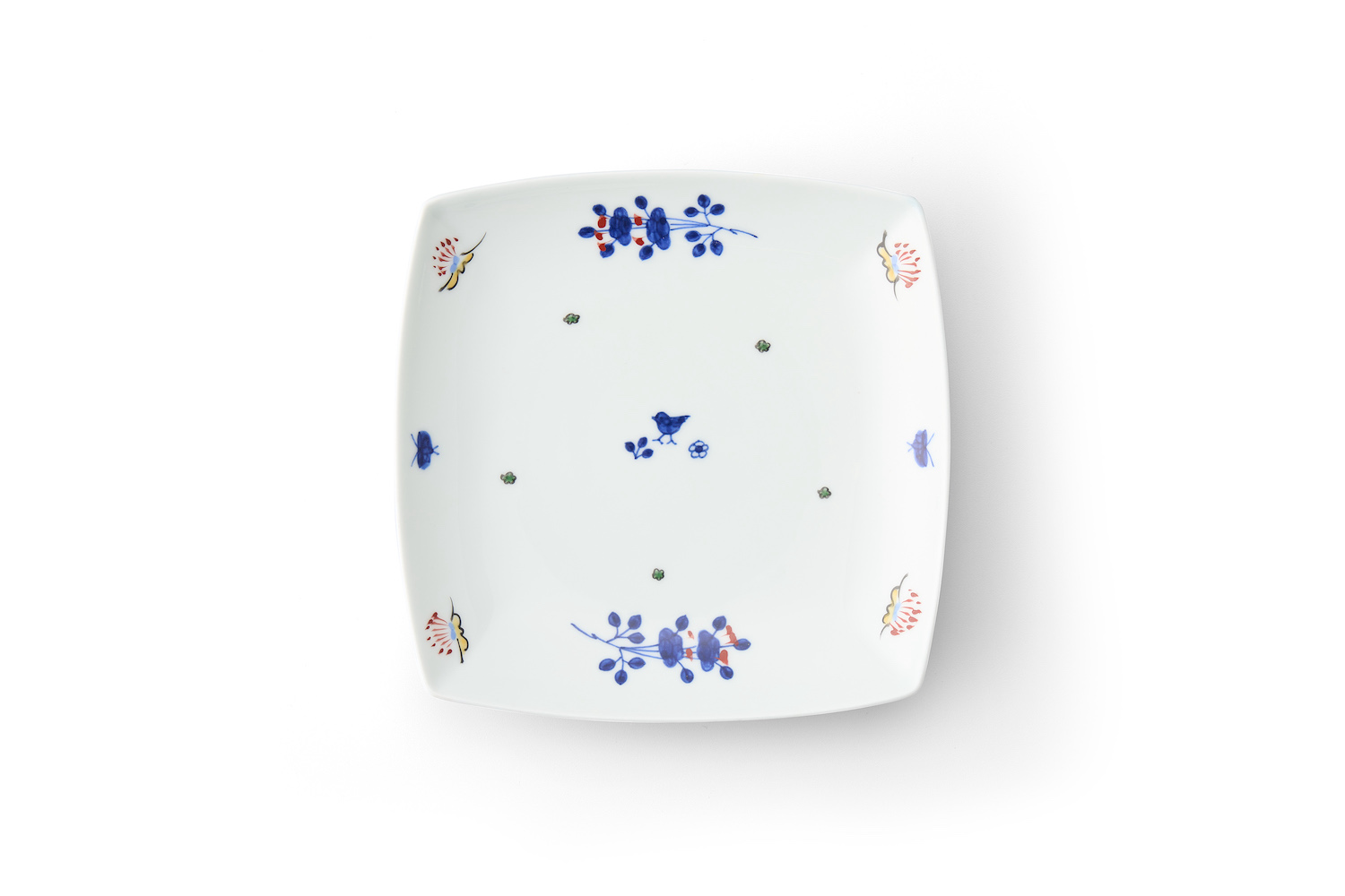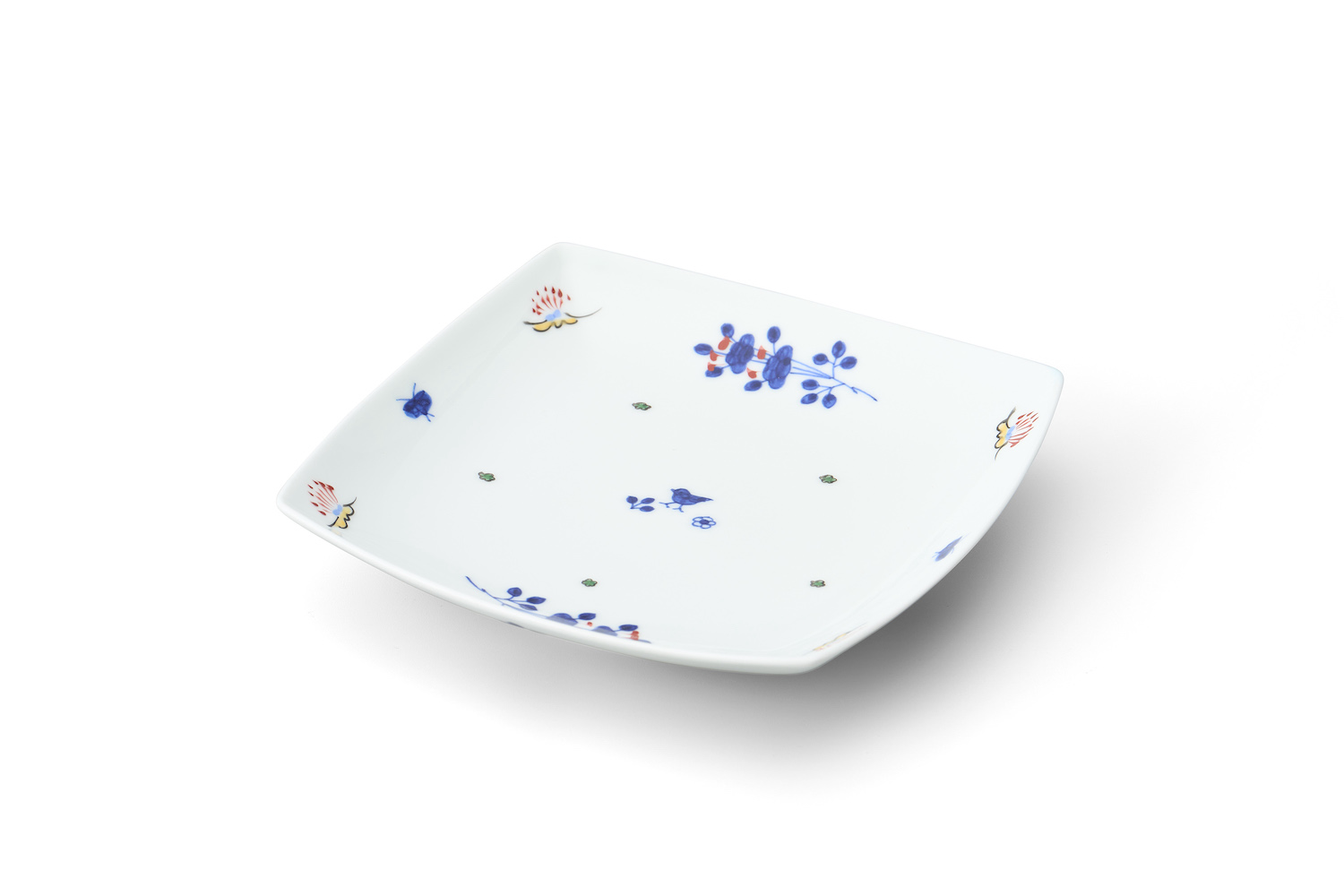 染付の花と小鳥の絵柄が可愛らしく、形が四角なので